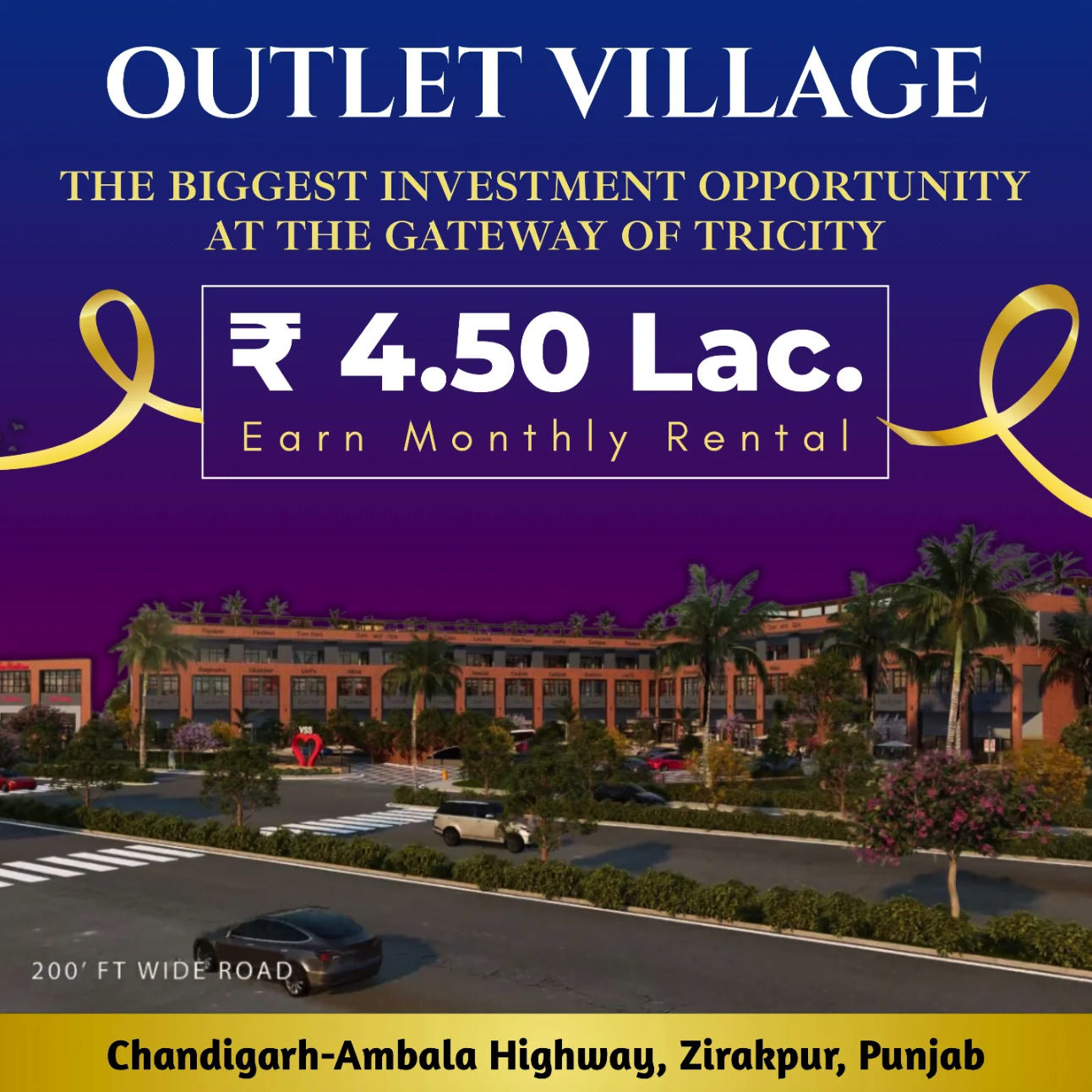 Outlet Village, Zirakpur is a premium 3-acre commercial township strategically located on the Delhi-Chandigarh National Highway. Designed as a high-street retail hub, the project is fully leased with top national and international brands, ensuring consistent footfall and robust rental income. With high visibility, seamless connectivity, and strong investment potential, Outlet Village offers one of the highest rental yields in the region—making it a lucrative destination for both investors and retailers.